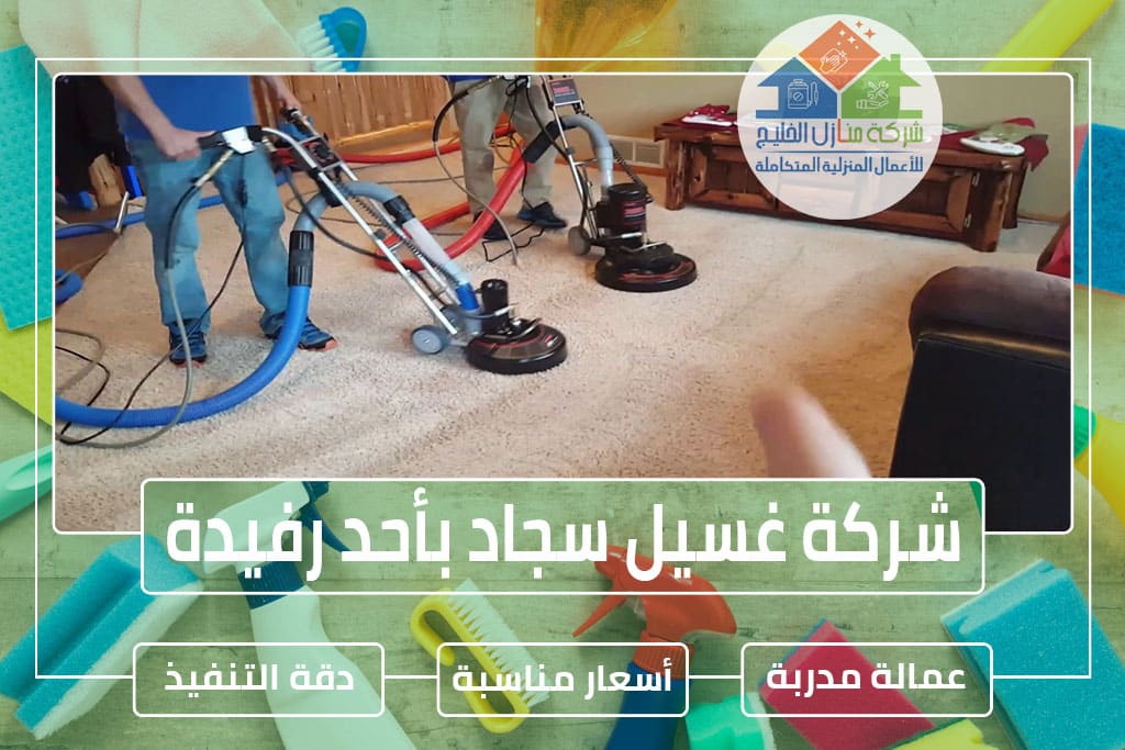 تمتاز شركتنا بأحد رفيدة بأتقانها وخبرتها وحرفيتها في تنظيف السجاد والموكيت، وتحرص شركتنا على توفير أحسن الخدمات بأسعار رخيصة ومغرية ومناسبة للعملاء ولجميع الفئات ومن تعامل معنا يشهد لنا.