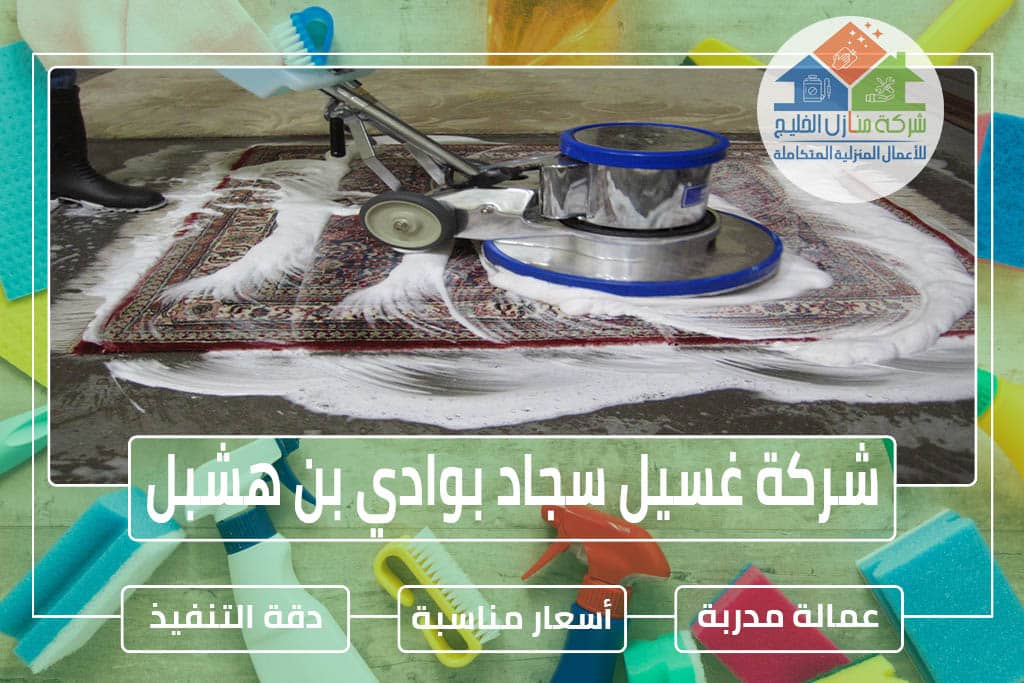 تعد شركة تنظيف سجاد وموكيت بوادي بن هشبل بأنها واحدة من أشهر وأكبر الشركات في تقديم أعمال التنظيف لكافة المفروشات، لأننا نعلم أهمية المفروشات وبأنه لا يخلو منزل من وجود السجاد ولكن بسبب لعب الأطفال يكون السجاد عرضة للاتساخ وتتراكم عليه البقع وتجد ربة المنزل تعب بعملية التنظيف وتحاول غسل السجاد ولكن لا تحصل على النتيجة المطلوبة ولذلك تلجأ للاستعانة بشركة متخصصة لكي تقوم بمساعدتها ولذلك شركة منازل الخليج الأفضل حيث تقدم خدماتها بأعلى دقة وجودة وكفاءة وبمقابل أقل الأسعار المناسبة مع جميع الفئات فتواصل وتأكد سيدي العميل بحصولك على مفروشات نظيفة وغير متسخة وسوف يقدم ضمان من أجل الاطمئنان بأننا الأفضل، والآن مع شركتنا لا تقلق نحن الأفضل بمجال التنظيف.